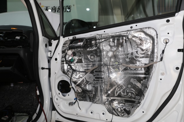 四门使用STP小炸弹+ACC6进行三层止震隔音处理,内层止震,加厚钣金,有效抑制共振;外层隔音,密闭多余孔位,将门板打造成一个“箱体”结构,可以让后期升级的中低音喇叭发挥更好的中低频效果。